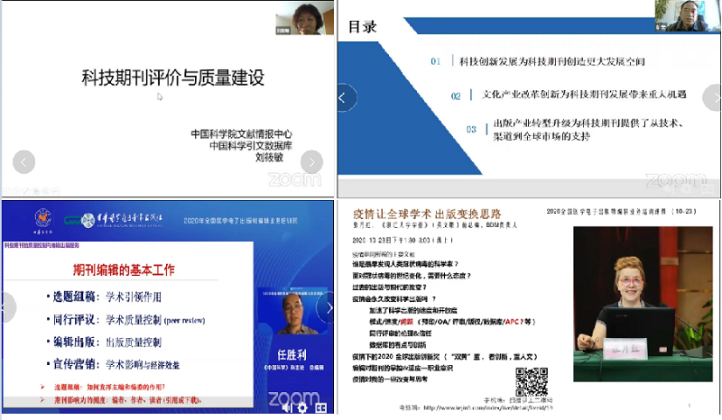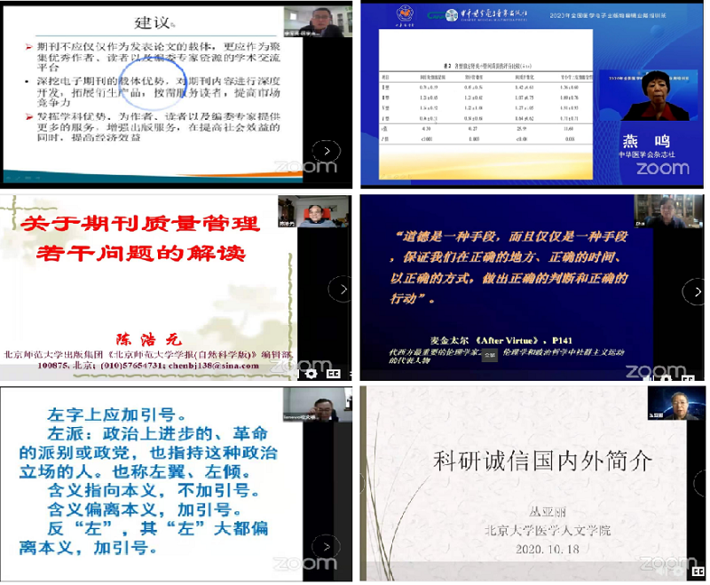 本次培训班首次开设电子期刊“总编论坛”,论坛特邀北京大学医学部图书馆李维副馆长主持,邀请部分期刊的总编介绍办刊经验,通过论坛形式开展了热烈的思想碰撞,为学员们传道授业解惑,也是大咖云集的智慧课堂。张英泽院士深情地介绍了自己担任总编的《中华老年骨科与康复电子杂志》的发展历程,他以身作则,积极响应国家号召,将论文优先发表在自己主编的杂志上,对学会创办世界一流期刊也给予极大的期许。姜军、严静、陈杰、徐如祥、岳茂兴等教授也分别通过有温度的话语介绍了各自期刊的办刊优势、特色以及“成长的烦恼”。虽然在新环境、新技术作用下每种期刊办刊情况各有不同,但每种期刊都在竭尽所能坚守办刊传统,立足办刊特色,守住初心和办刊使命。通过论坛,受邀总编辑们与线上学员聚焦期刊发展展开交流与互动,共话期刊出版的使命与责任担当。在聆听诸位学术大咖答疑解惑与交流中,专家们的品格、学识、出版情怀以及对期刊出版的真知灼见,也深深感染和激励着我们这些编辑出版人,坚定我们办出精品期刊的决心和信心。